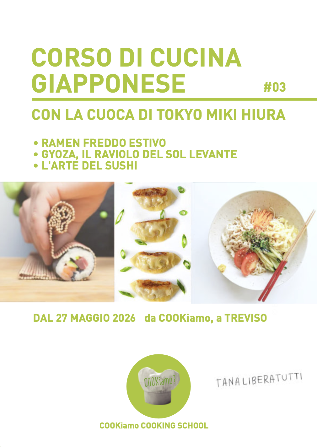Al via il nuovo corso di cucina dedicato agli appassionati del Giappone, che inizierà il 27 maggio con la nostra cuoca di Tokyo Miki Hiura. Miki ha una lunga esperienza come Chef di prestigiosi ristoranti giapponesi in Veneto, ed è ora occupata nella divulgazione della cucina tradizionale del Sol Levante sul territorio.