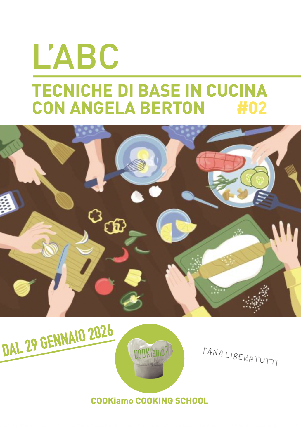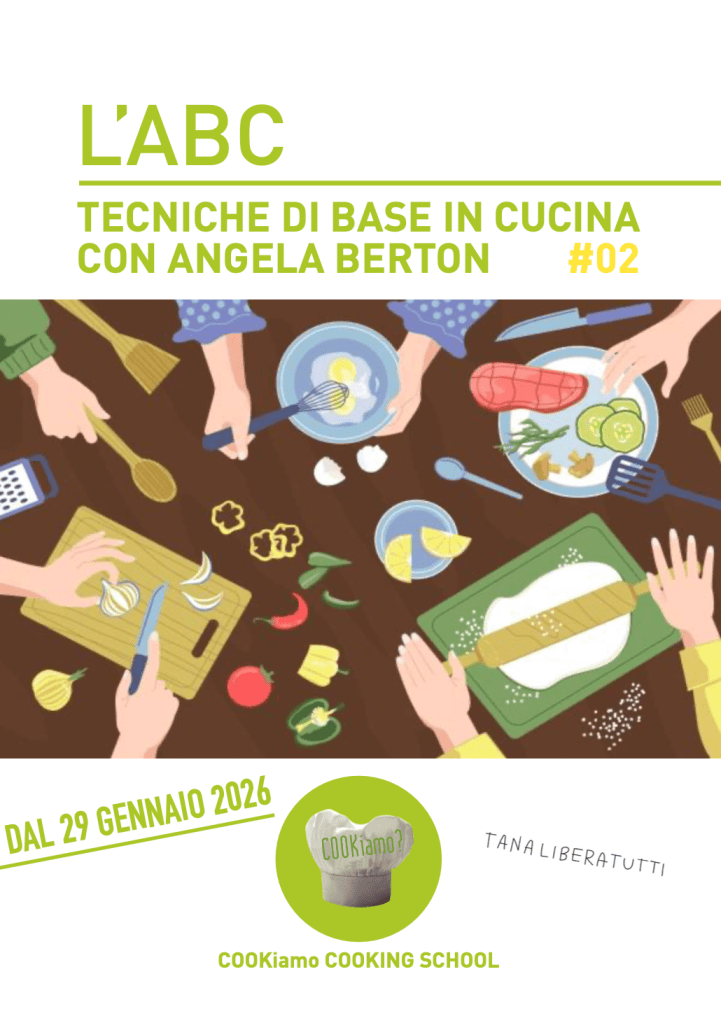 In questo corso di cucina con Angela Berton impareremo ad eseguire le ricette di base fatte a regola d’arte, ma soprattutto le tecniche generali che potranno essere applicate sempre, dai piatti più semplici a quelli un pò più elaborati. Il corso è strutturato in 6 lezioni tematiche (frequentabili anche singolarmente per chi volesse) per imparare i segreti della cucina, capire come scegliere e sfruttare al meglio gli ingredienti e gli utensili, non ultimo conoscere e confrontarsi con persone che hanno il tuo stesso desiderio di imparare l’arte del cucinare.